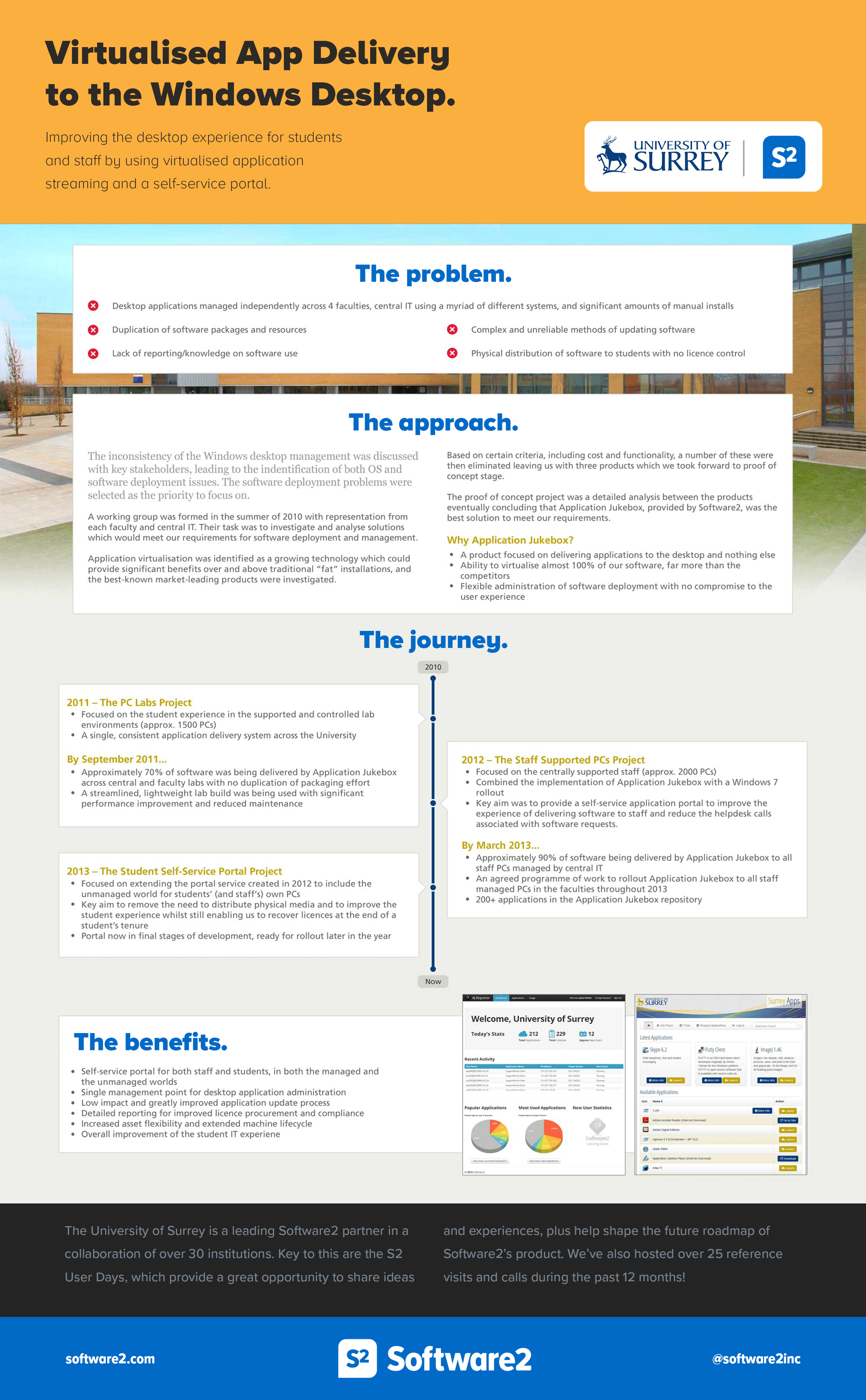 The University of Surrey has a central IT department working in partnership with four faculties. In order to keep up to date with the dynamic technology market and to continue providing cutting edge systems to staff and students, the IT team saw an opportunity to improve its current software delivery and distribution process.